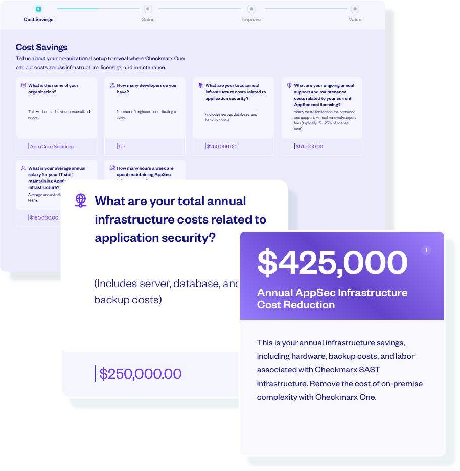 The calculator used a combination of traditional and non-traditional measurements to calculate the value of migrating to Checkmarx One. Users were evaluated on and provided with insights on four categories: